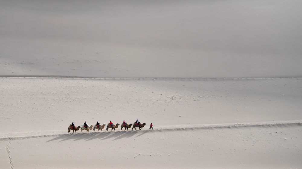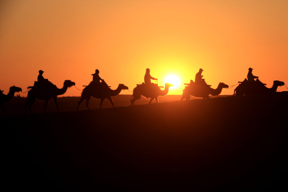 游客骑着骆驼在敦煌鸣沙山月牙泉景区游览(2023年6月7日摄)。新华社发(张晓亮摄)