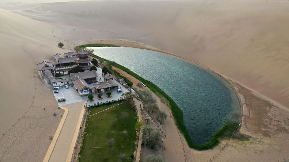 这是敦煌鸣沙山北麓的月牙泉(2023年4月24日摄,无人机照片)。新华社记者 陈斌 摄