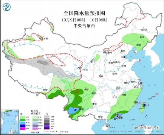 图1 全国降水量预报图(10月8日08时-9日08时)
