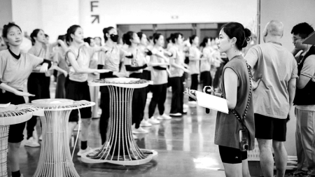 经过层层选拔,最终组委会相关负责人在该院舞蹈系10余个舞蹈专业班级中选拔出100名参演学生(50名男学生、50名女学生),并于7月29日来到杭州亚运会开幕式现场“大莲花”(奥体中心体育场),进行了两个月的紧张排练。