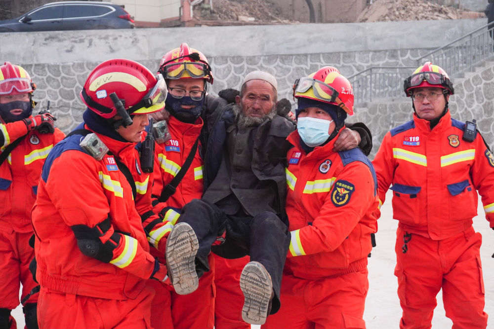 ↑ 12月19日,在甘肃省临夏回族自治州积石山保安族东乡族撒拉族自治县大河家镇大河村,消防人员开展救援。新华社记者马希平摄