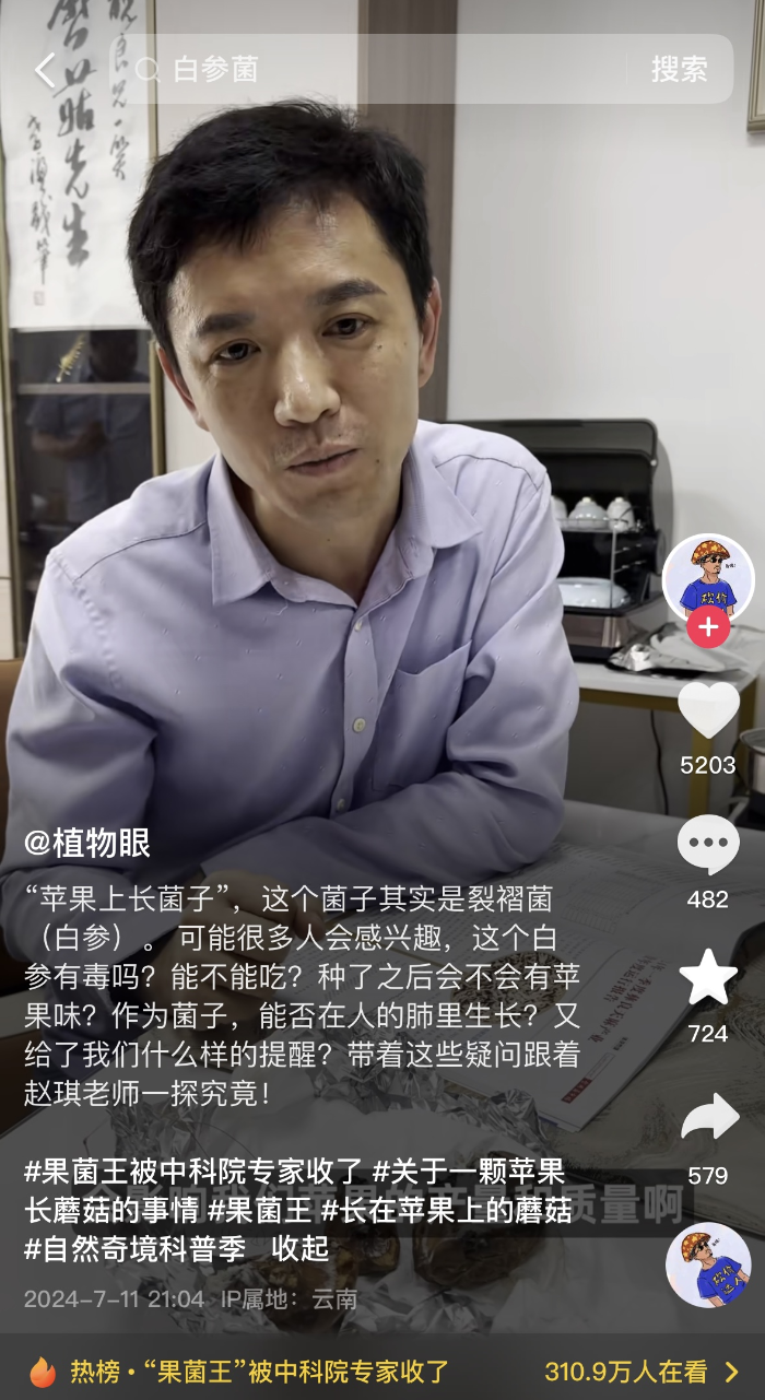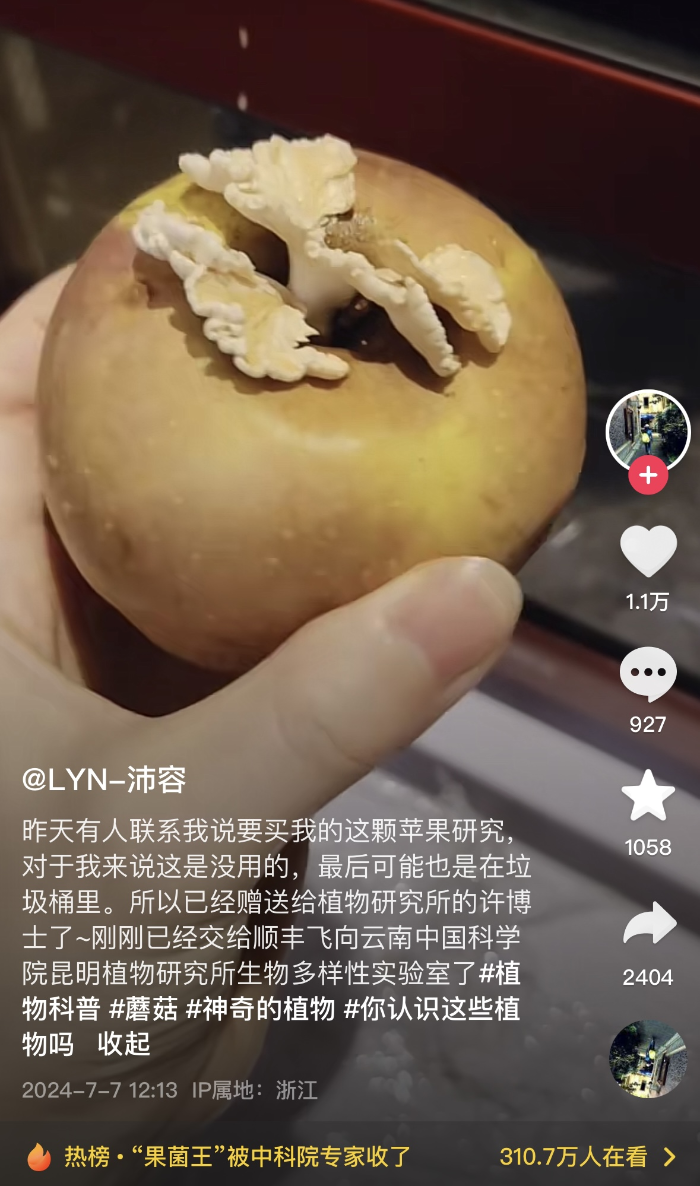 将苹果长蘑菇跟网友长知识连接起来的,是涉事科研人员有料且有趣的科普。他们来得正是时候的科普,让此事在“长菌苹果”自带的猎奇色彩和“千里求菌”的戏剧性之外,多了些社会价值:在他们顺势科普前,“长菌苹果”留给网友的就是个“果菌王”的网梗;在他们展开科普后,“长菌苹果”让很多网友头一次知道了“裂褶菌(又叫白参)”的存在。