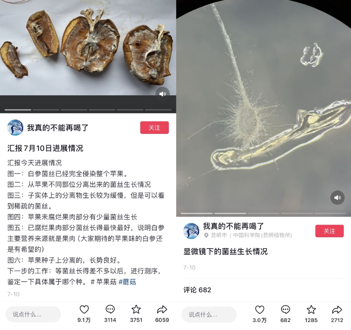 拿到样本后,许博士对苹果做了切片观察,还在抖音上向网友实时更新起了菌丝生长情况,引发越来越多网友的“追更”。之后又有科普创作者@植物眼 专门采访许博士的导师赵琪,他的细致讲解让很多网友纷纷表示“又学到了新知识”。
