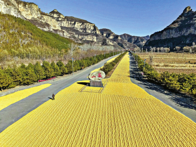 山西晚报·山河+讯(记者 温丽芳)近日,在阳泉盂县藏山景区,一条由金黄玉米铺就的“黄金大道”,在青山、蓝天的映衬下,构成一道别样的冬日风景。据了解,藏山景区主动腾退千米道路,为周边农户提供免费晾晒场地,让丰收的玉米与巍峨的太行山水相映成画,绘就了一幅农旅共融的生动图景。