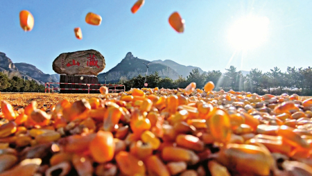 从空中俯瞰,景区标志性的刻有“藏山”字样的巨石,被连片的玉米“花海”环绕,绵延千米的道路上,玉米粒被村民们精心铺成整齐的波纹状,宛如一条流淌的金色长河。“今年景区把这么宽的路让给我们晾晒粮食,真的解决了我们一大难题!”正在翻晒玉米的村民李师傅说道。