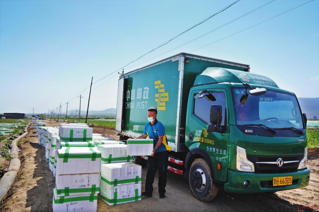 6月18日,天猫网购节,五寨县邮政公司将邮政运输车辆直接开到该县蔬菜生产基地,将新鲜的蔬菜及时发往全国各地。 张向荣摄