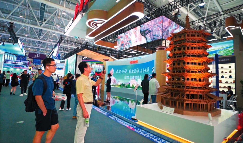 山西晟龙木雕模型艺术有限公司制作的应县木塔模型一亮相,便吸引了众多观展游客的目光。精美绝伦的造型引得人们啧啧称奇,纷纷拿出手机拍照记录分享。该模型高约3米,最大直径1.9米,通过20∶1的比例微缩打造,复刻了应县木塔的榫卯结构,其内部楼梯扶手清晰可见,门窗都能打开。“我们的这件展品,是由二十多个师傅经过半年多的时间完成的。这次为了来深圳参展,我们专门把它从定襄装运发车,用了整整两天半的时间才送到,跨越了将近两千公里。”该公司总经理张艳峰告诉记者。