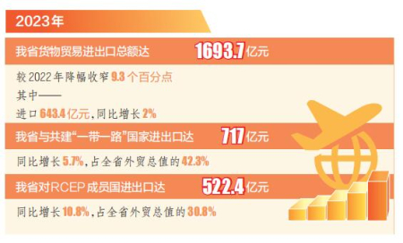 本报讯(记者孟婷)2月14日,记者从太原海关获悉,据统计,2023年我省货物贸易进出口总额达1693.7亿元,较2022年降幅收窄9.3个百分点。其中,进口643.4亿元,同比增长2%。同期,我省与共建“一带一路”国家进出口达717亿元,同比增长5.7%,占全省外贸总值的42.3%。我省对RCEP成员国进出口达522.4亿元,同比增长10.8%,占全省外贸总值的30.8%。