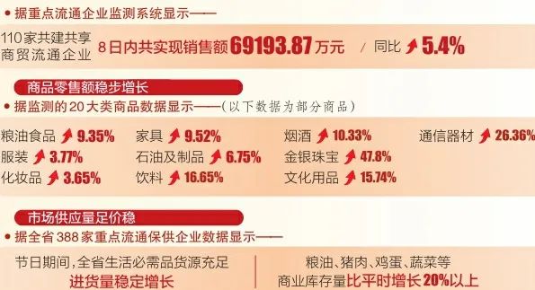 商品零售额稳步增长。各市结合消费者追求绿色健康、彰显个性多样、青睐科技智能等方面的消费新需求,通过发放政府电子消费券或指导商圈集聚营销、品牌商品展销、特色商品促销等形式,持续拉动消费增长。据了解,全省各大商场节日礼盒、时令水果、糖果糕点、地方土特产、健康保健品、牛奶、饮料、烟酒等销售旺盛。据监测的20大类商品数据显示,粮油食品、服装、化妆品、家具、石油及制品同比分别增长9.35%、3.77%、3.65%、9.52%和6.75%;饮料、烟酒、金银珠宝、文化用品、通信器材等实现了两位数以上的增长,分别为16.65%、10.33%、47.8%、15.74%和26.36%。
