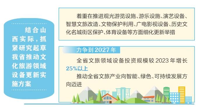 系统推进,夯实重点任务。结合山西实际,抓紧研究起草我省推动文化旅游领域设备更新实施方案,着重在推进观光游览设施、游乐设施、演艺设备、智慧文旅改造、文物保护利用、广电影视设备、历史文化名城街区保护、体育设备等方面细化更新举措,明确更新提升重点,力争到2027年,全省文旅领域设备投资规模较2023年增长25%以上,推动全省文旅产业向智能、绿色、可持续发展方向迈进。