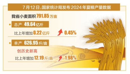 本报讯(记者王秀娟)7月12日,国家统计局发布2024年夏粮产量数据,我省小麦面积791.85万亩;总产49.64亿斤,比上年增加0.22亿斤,增长0.45%;单产626.95斤/亩,创历史新高,比上年增加12.19斤/亩,增长1.98%。