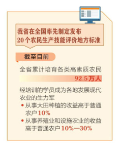 2014年开展农民教育培训工作以来,我省各级农业农村部门围绕全面支撑粮食安全和重要农产品稳定供给,统筹推进农业经理人、农村创新创业者、乡村治理及农村社会事业发展带头人和种养加能手等六大类开展培训,为推进乡村全面振兴提供了有力人才保障。我省还在全国率先制定发布20个农民生产技能评价地方标准,建立了涵盖主要农作物种植品种和畜禽养殖品种的技能评价标准体系。截至目前,全省累计培育各类高素质农民92.5万人,高素质农民培育绩效考核持续排在全国优秀行列。经培训的学员活跃在农业生产经营各领域,成为各地发展现代农业的生力军,从事大田种植的收益高于普通农户10%,从事养殖业和设施农业的收益高于普通农户10%—30%。