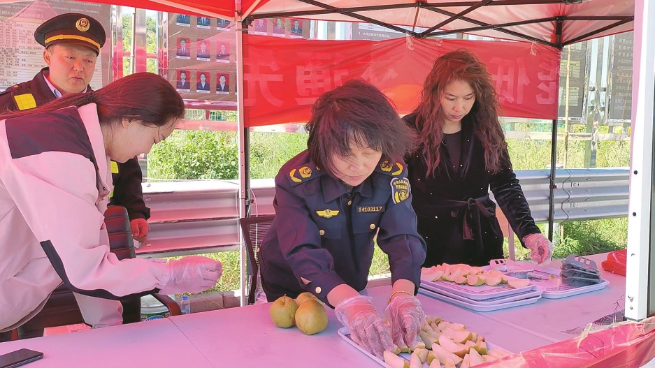 国庆长假的几天里,隰县4个高速口设置便民服务站,游客一进入隰县,就能吃到当地干部递上的玉露香梨,享受免费引导服务。