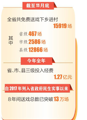 2017年该活动列入省政府民生实事以来,8年间送戏总数已突破13万场,让人民群众真切感受到了党和政府的关怀和温暖。
