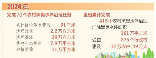 我省对农村生态环境治理工作高度重视,2024年政府工作报告提出,要“完成50个农村黑臭水体治理任务”。一年来,我省各级各部门积极投入力量,挖掘打通资源,用心用情用力办好这一民生实事。生态环境部门更是自加压力,完成了70个农村黑臭水体治理任务,累计铺设污水管网91千米,清理垃圾2.2万立方米,清理淤泥39万立方米,修建生态护岸7.9万平方米,种植植物11万平方米,促进重点关注水体所在村庄生态环境质量明显改善,并以标志性成果让农民群众对治理效果可感可及,真正让农村黑臭水体治理工程成为普惠的民生工程。