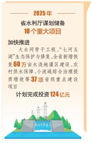 水资源的有效管理与利用是推动高质量发展的重要基础。今年,省水利厅围绕水资源调配、防洪减灾、农村供水、灌区现代化改造、河湖生态修复、地下水超采治理、水土保持等重点工作,谋划储备10个重大项目,加快推进大水网骨干工程、“七河五湖”生态保护与修复、全省新增恢复60万亩水浇地灌区建设、农村供水保障、小流域综合治理提质增效等37项省级重点建设项目,计划完成投资124亿元,为全省高质量发展提供有力的水安全保障。