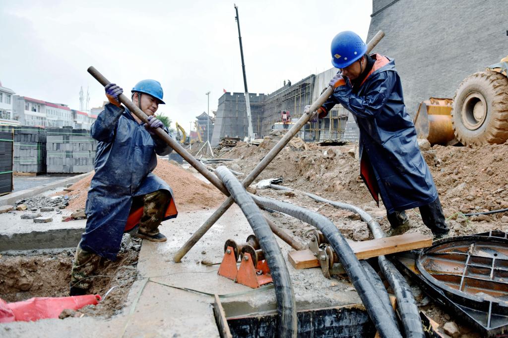 国网忻州供电公司员工在秀容古城电力配套建设现场敷设电缆
