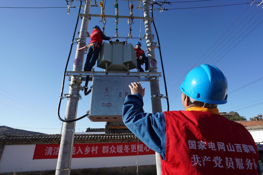 山西-电网建设-2020年10月3日,国网岢岚县供电公司员工在团城子村“煤改电”现场紧固高压引线设备线夹(边武摄)
