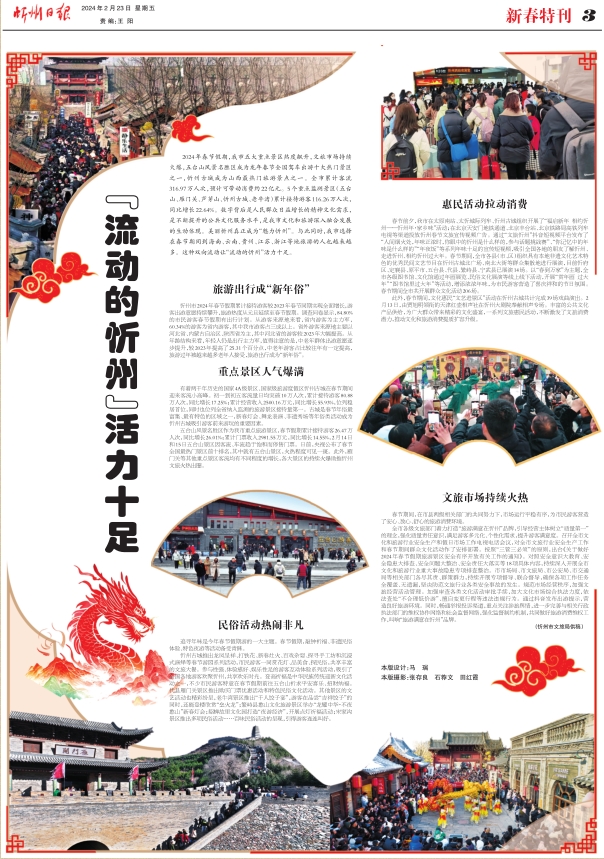 此外,春节期间,文化惠民“文艺进景区”活动在忻州古城共计完成39场戏曲演出。2月13日,由贾旭明领衔的天津红壶相声社在忻州大剧院奉献相声专场。丰富的公共文化产品供给,为广大群众带来精彩的文化盛宴,一系列文旅惠民活动,不断激发了文旅消费潜力,推动文化和旅游消费提质扩容升级。