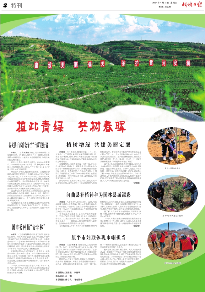 本报讯 (记者刘芝彤)春回大地万物苏,植树添绿正当时。为深入贯彻习近平生态文明思想,牢固树立和践行“绿水青山就是金山银山”理念,进一步提高全市青少年生态环保和植绿护绿意识,引领青少年争做生态文明的传播者、环境保护的促进者、绿色家园的建设者,近日,团市委带领青年志愿者前往原平市子干乡停旨头村参与全民义务植树活动。
