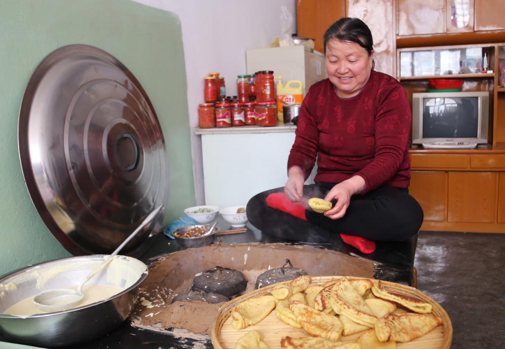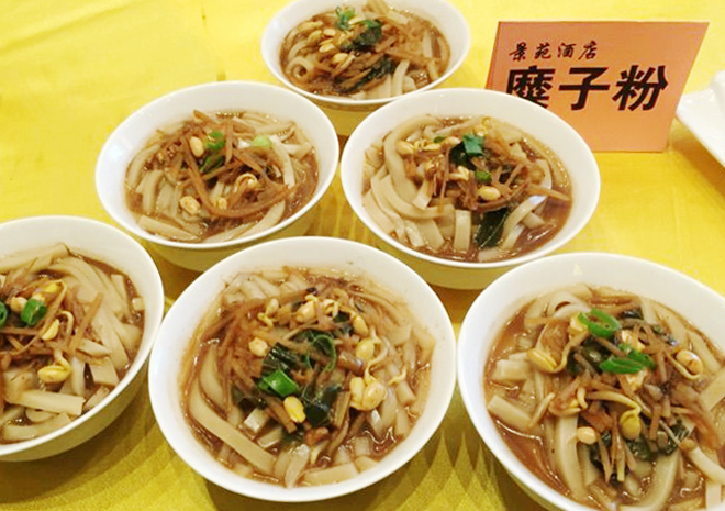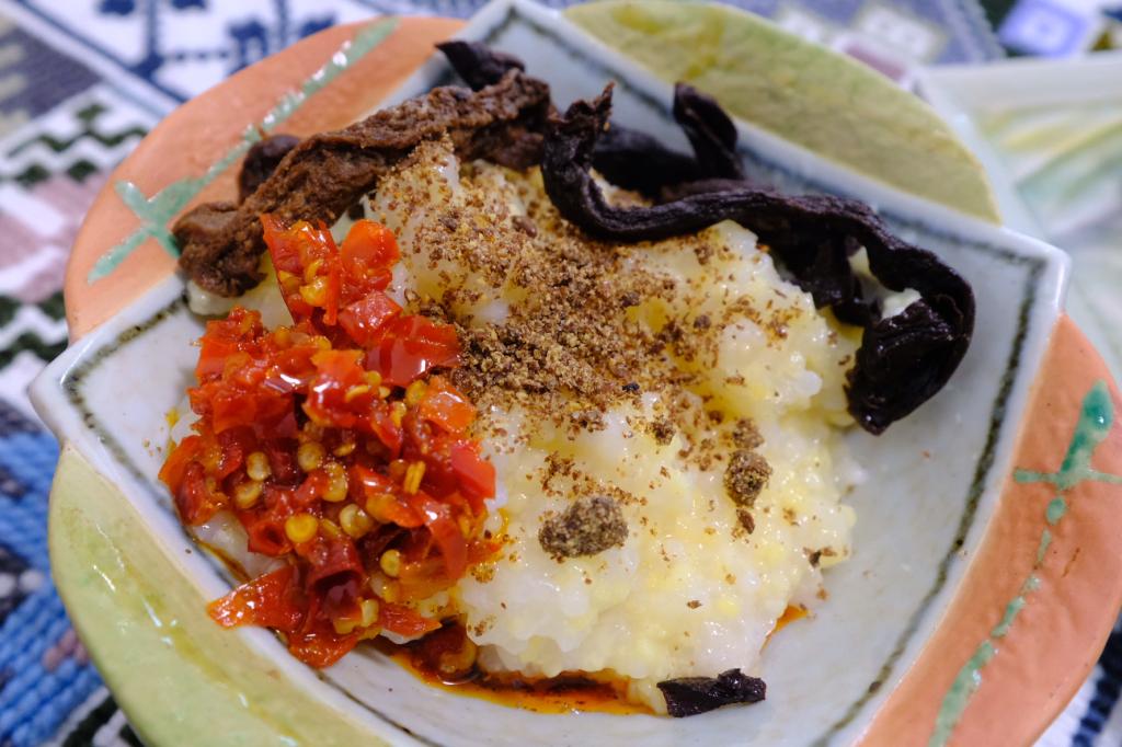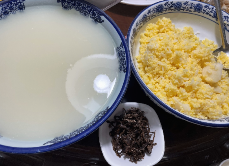 (酸粥配上偏关人自制的红腌菜、麻面子,甚是美味。摄影赵婧)