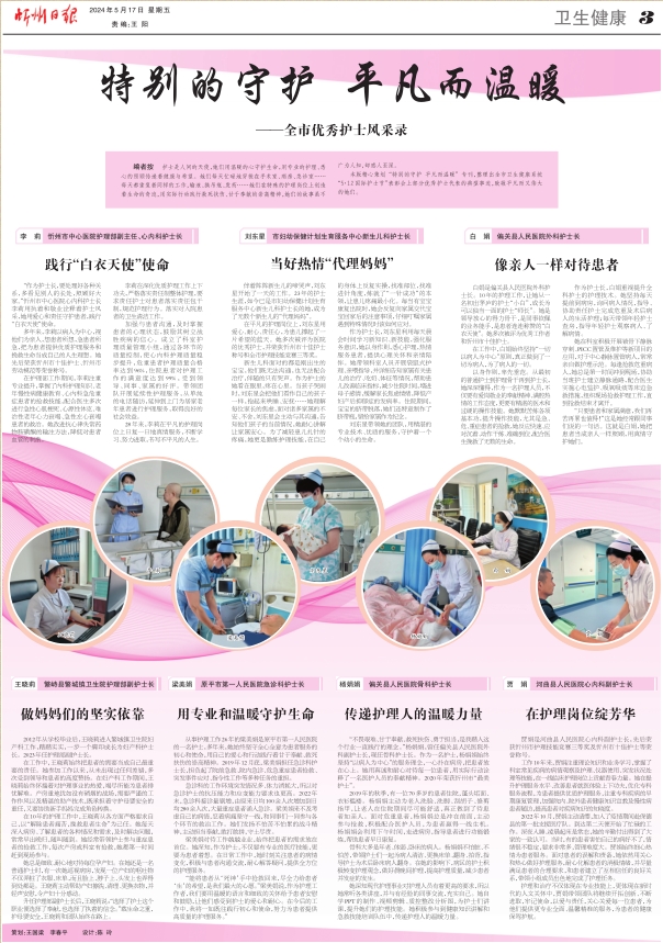 本版精心策划 “特别的守护 平凡而温暖” 专刊,整理出全市卫生健康系统“5·12国际护士节”表彰会上部分优秀护士代表的典型事迹,致敬平凡而又伟大的她们。