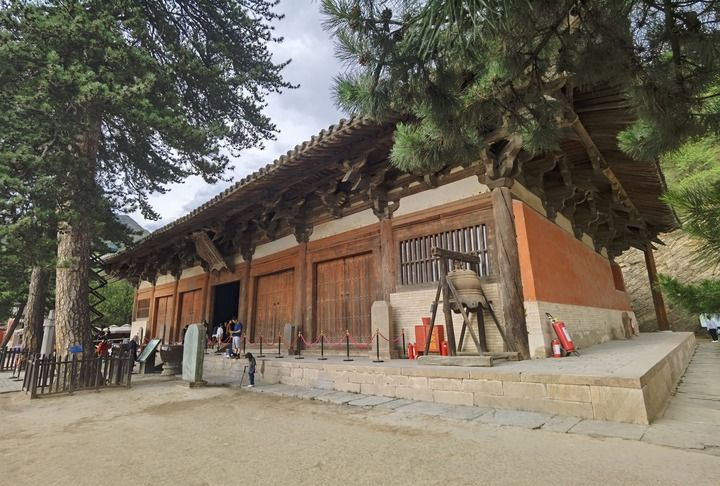 扶着栏杆,爬上陡峭高耸的台阶,东大殿就映入眼帘。一眼看去,大唐遗风扑面而来。大殿灰瓦红墙,面阔七间,深远的屋檐下雄大的斗栱、斑驳的匾额、厚重的木门,诉说着悠远的岁月。
