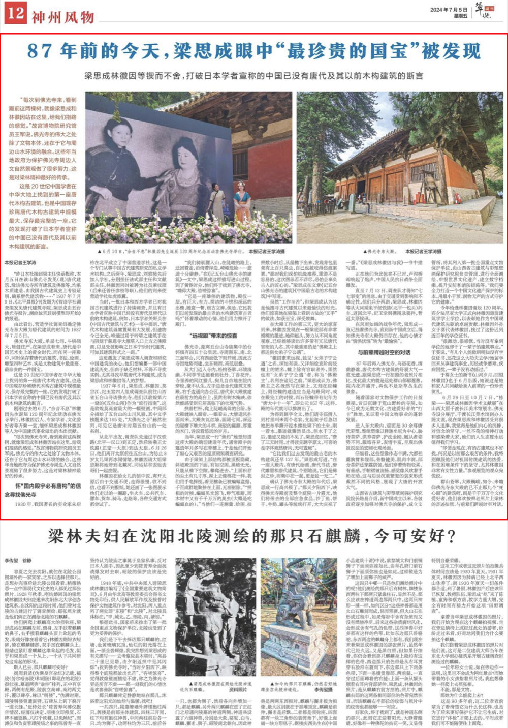 “昨日本社接到梁主任快函报称,本月五日在该山佛光寺发见(现)唐代建筑,缘该佛光寺所有建筑及佛像等,均系木质建造,由我国古代建筑史上考验证明,确系唐代建筑物……”1937年7月9日,《北平晨报》刊发题为《营造学社调查组发见唐代建筑寺院,梁思成由五台佛光寺报告,测绘故宫赶制模型即开始》的报道。