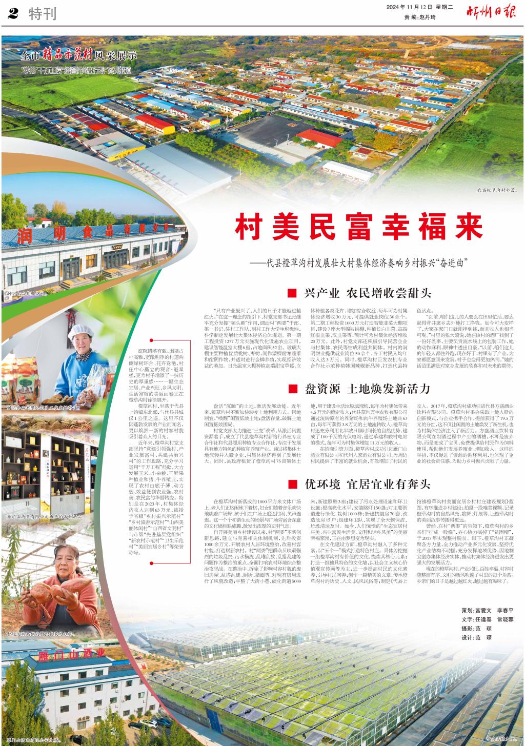 “只有产业振兴了,人们的日子才能越过越红火。”在这一理念的指引下,村党支部书记张继平充分发挥“领头雁”作用,调动村“两委”干部、第一书记、驻村工作队、到村工作大学生积极性,科学制定发展壮大集体经济总体规划。第一期工程投资1277万元实施现代化设施农业项目,建设智能温室大棚6座,占地面积52亩。玻璃大棚主要种植优质桃树、枣树,间作矮棵耐寒蔬菜和耐阴作物,并适时进行金蝉养殖,实现经济效益的叠加。日光温室大棚种植高端甜宝草莓,立体种植各类花卉,增加综合收益,每年可为村集体经济增收30万元,可提供就业岗位30余个。第二期工程投资1000万元打造智能韭菜大棚项目,建设7座大型棉被拱棚,种植长白韭菜、高端红根韭菜、汉韭菜等,预计可为村集体经济增收20万元。此外,村党支部还积极引导民营企业与村集体、农民等结成利益共同体。村内的润明饼业提供就业岗位50余个,务工村民人均年收入达3万元。同时,橙草沟村巨发农机专业合作社示范种植韩国辣椒新品种,打造代县特色试点。