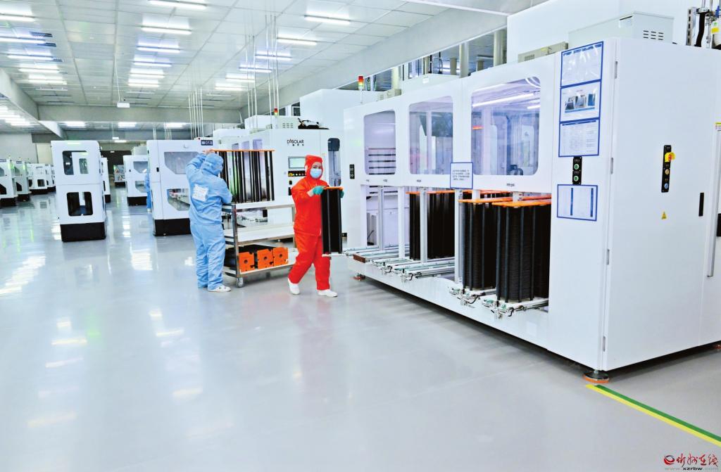 项目于2023年3月投产运营。目前,2号厂房已实现满产,1号厂房设备安装调试已近尾声,即将投产。项目全面投产达效后,产能达到“50GW电池+50GW组件”,可实现年产值60亿元,年上缴税收3亿元,提供就业岗位1400个。