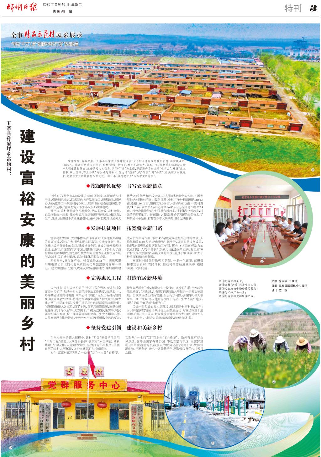 富康富康,富裕安康。五寨县孙家坪乡富康村是由12个村合并而成的移民新村,共有834户、1815人。在政府的关心支持下,在村“两委”带领下,村民齐心协力、集思广益,将物质文明建设与精神文明建设相结合,充分调动内生动力,以“和”“美”为主题,不断提升乡村文明“软实力”,建设“点上出彩、线上美丽、面上协调”的全域美丽乡村,努力增“颜值”、提“气质”、升“品质”,让美丽乡村靓起来,向宜居宜业的新农村昂首迈进。2021年,该村被评为“山西省文明村庄”。