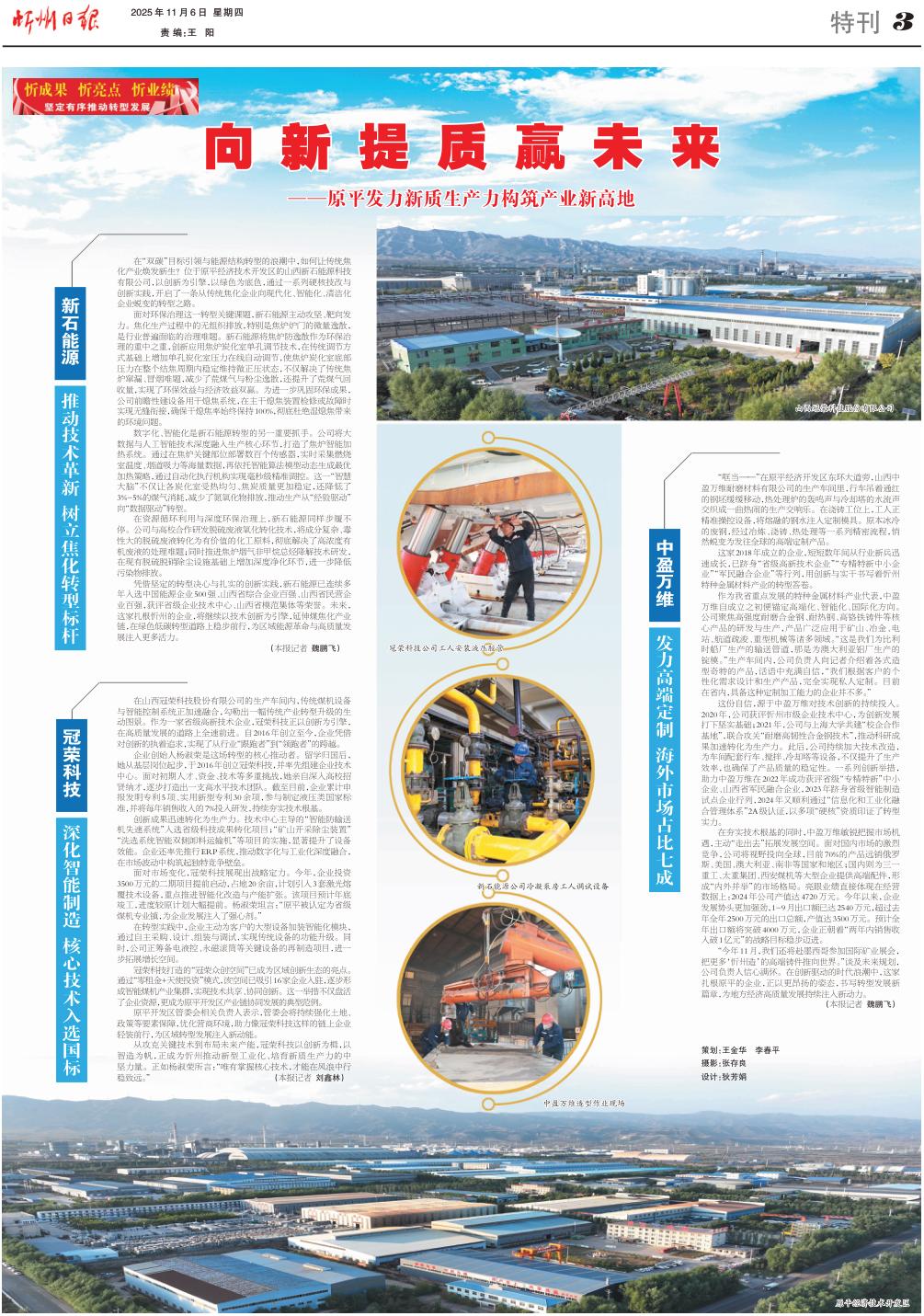 “今年11月,我们还将赴墨西哥参加国际矿业展会,把更多‘忻州造’的高端铸件推向世界。”谈及未来规划,公司负责人信心满怀。在创新驱动的时代浪潮中,这家扎根原平的企业,正以更昂扬的姿态,书写转型发展新篇章,为地方经济高质量发展持续注入新动力。(本报记者 魏鹏飞)