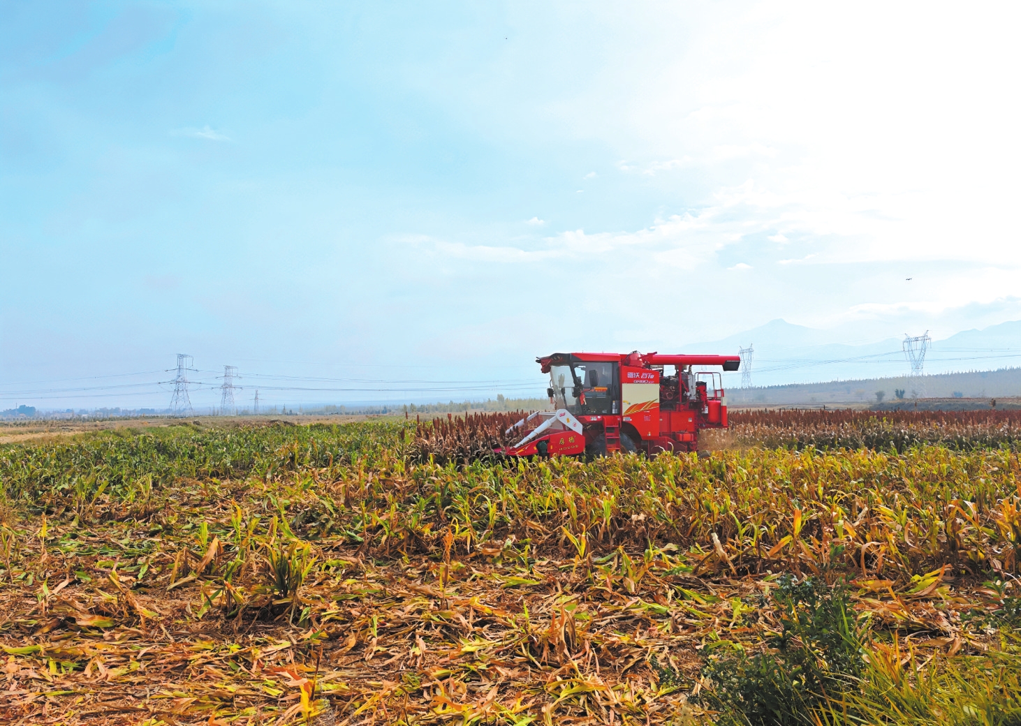图为村民正操作农机收获高粱。本报记者 赵丹琦摄