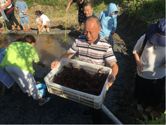 在郴州市吴山村小龙虾养殖基地,一群游客围在一个养虾池边欢笑不断,不时响起一声声惊喜的尖叫,这里正在进行一场“钓虾大赛”。