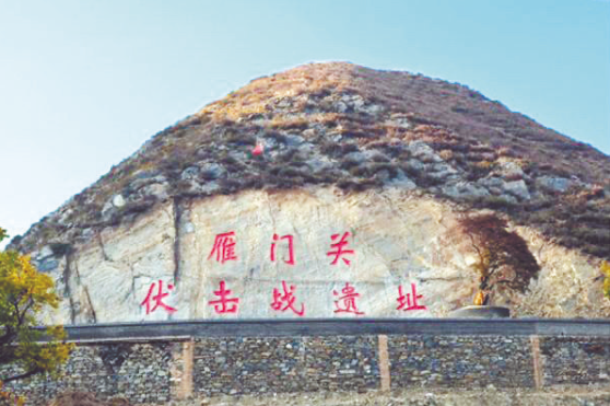 雁门关伏击战遗址就在代县雁门关乡黑石头沟,南北长1000米,东西宽200米,遗址现留存被炸毁的大桥墩。远处石壁上铭刻着“雁门关伏击战遗址”八个鲜红的大字,崖下有块巨石上面记载着雁门关伏击战中,70位烈士奋勇杀敌、为国牺牲的故事。