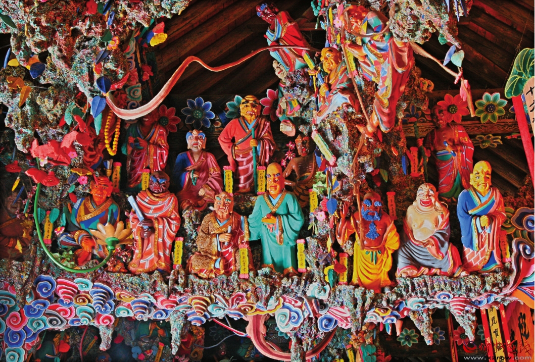 金阁寺现存的寺庙建筑及塑像,均在明、清、民国复修。寺庙坐北向南,占地面积2.l万平方米,呈正方形。穿牌坊,登台阶,进天王殿,殿檐下挂着题有“金阁寺”的大匾。在第一处大院中间,矗立一座大阁,内供高17.7米的千手(实为48臂)观音铜像,这是五台山最高最大的圣像。像原本为铜铸,造于明嘉靖四年(1525年),后人重修该寺时,为使观音更加中性化,便在铜像外面贴泥、金妆,从肩膀两旁伸出许多胳膊,手执各种兵器,加成了48臂,显得异常威武,号千手观音。殿阁内,左右后柱两个1米高的石柱础,为圆形中间束腰上下卷莲瓣形,是唐代遗物。