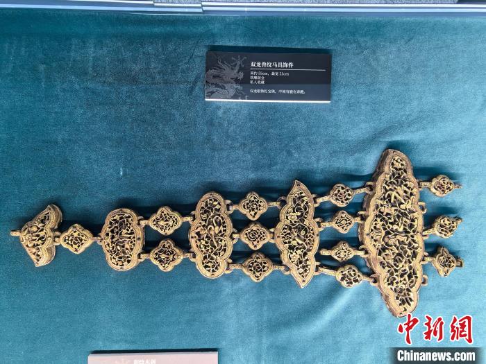 4月9日,金龙巧牵京藏情——《高原中华龙》主题展览在北京西藏文化博物馆开幕。图为展品双龙兽纹马具饰件。中新网记者 刘玥晴 摄