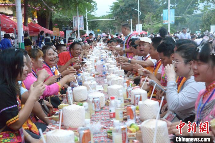 4月11日,2024年海南黎族苗族传统节日“三月三”节庆活动主会场活动长桌宴在保亭黎族苗族自治县举行。张月和 摄