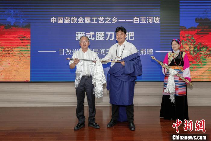 而甘孜州民族民间手工艺非遗协会会长、金属锻造传承人日多向杭州工艺美术博物馆捐赠了来自中国藏族金属工艺之乡——白玉河坡的两把藏式腰刀。德格印经院雕刻负责人、雕版印刷非遗传承人江永扎巴则捐赠了两件珍品:一件是大藏经《甘珠尔》佛像全集版画,共有58张,内容包括208个佛像和9个塔的图像,共计217个图像;另一件是《千手千眼观音》唐卡印版图画,这是收藏在德格印经院里面最早的佛像印版之一,距今四百多年。