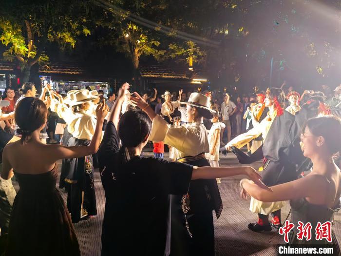 值得一提的是,为了让观众更好地感受横断秘境的特色,开幕式当晚,甘孜州木雅文化艺术博览中心的演员们继续在中国刀剪剑博物馆、中国伞博物馆的运河入口处,进行锅庄舞表演,带领民众共同感受锅庄舞这一国家级非遗的魅力。