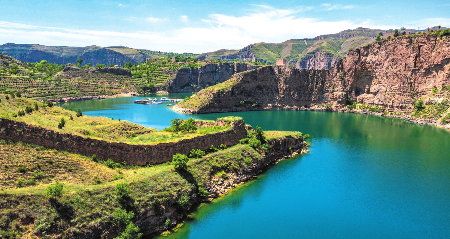 从壶口到禹门口,沿途有不少观景台,下临深谷,白浪翻卷,水声响亮。黄河泛黄时候,观景台上只闻水声轰鸣,看不出浪花。此时黄河清,白浪显,成了新景。抵达禹门口,黄河也是绿的,游艇在河里开过,水面上划出道道波纹,宛如铺展着的巨幅油画。