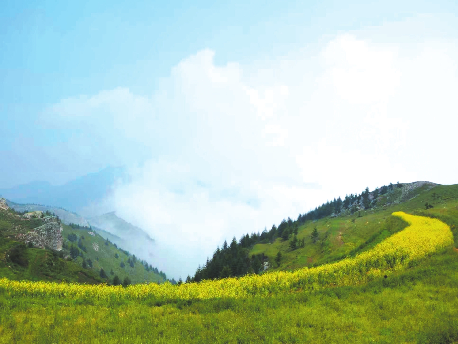村子前面有一片油菜花,地块随山形而走,有长没宽,只弯不直,恰似一个懒散人不守规矩信手涂画的U形圈,在高处远望时却像一条飘逸的黄丝带。