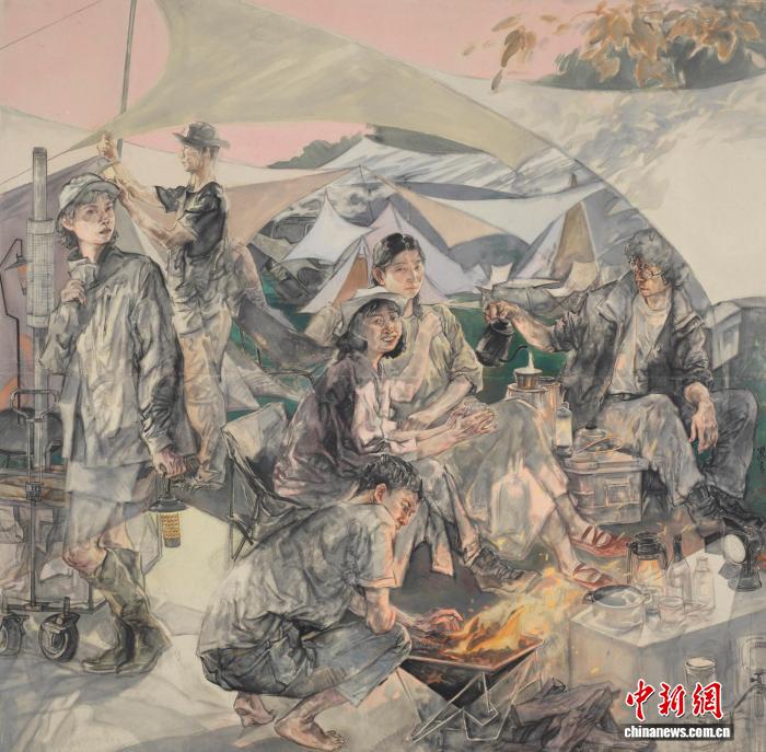 以画家蔺洁青的中国画《清风徐来》为例,其是浙江省第十五届美术作品展金奖作品,以传统人物画技法表现当代青年郊野露营场景,通过描绘清风拂过林间被永恒定格的瞬间,传递都市人向往自然、追求心灵自由的当代精神,展现出中国传统绘画语言在表现现实题材上的蓬勃生命力。