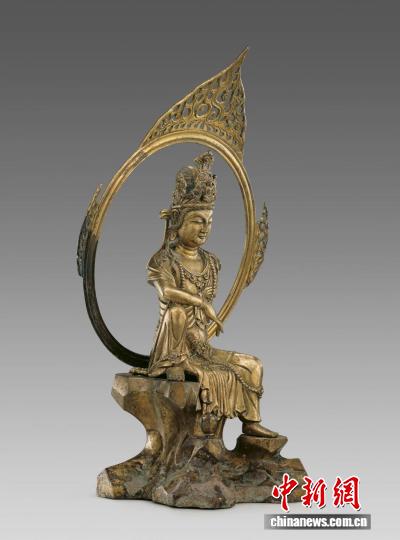 中新网金华9月17日电(董易鑫 孙媛媛)高53厘米,整尊观音头戴高冠,冠上饰化佛,身佩璎珞,左臂撑岩,右臂置膝,左腿下垂,右腿上曲足踏岩石,安坐于山岩之上,身旁石上置一净瓶,身后一圆轮状大背光,浑圆精美,边缘装饰火焰纹,仿佛岩前有潺潺流水,观音目观水中月影——这是68年前出土于浙江金华万佛塔地宫的五代鎏金铜观音造像,也叫作“水月观音”,是国家一级文物,现藏于中国国家博物馆。