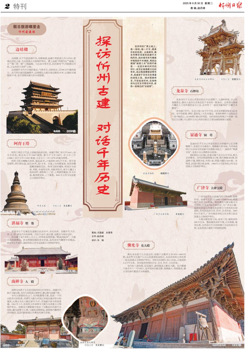 在忻州的广袤土地上,每一块砖、每一片瓦,都是历史的低语。从南禅寺、佛光寺榫卯间留存的唐代木构风华,到洪福寺宋代雕塑中凝固的千年佛韵,再到边靖楼“威镇三关”的明代雄姿……这些古建似时空的切片,或见证着佛教文化的传承,或以精美雕塑诠释艺术,是感受千百年历史厚重的绝佳之选。国庆假期将至,不妨走进忻州,在凝眸间与过往岁月隔空对话,收获一段难忘的“古建游”。