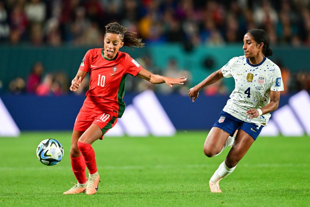 8月1日,葡萄牙队球员杰茜卡·席尔瓦(左)与美国队球员吉尔马拼抢。新华社记者朱炜摄
