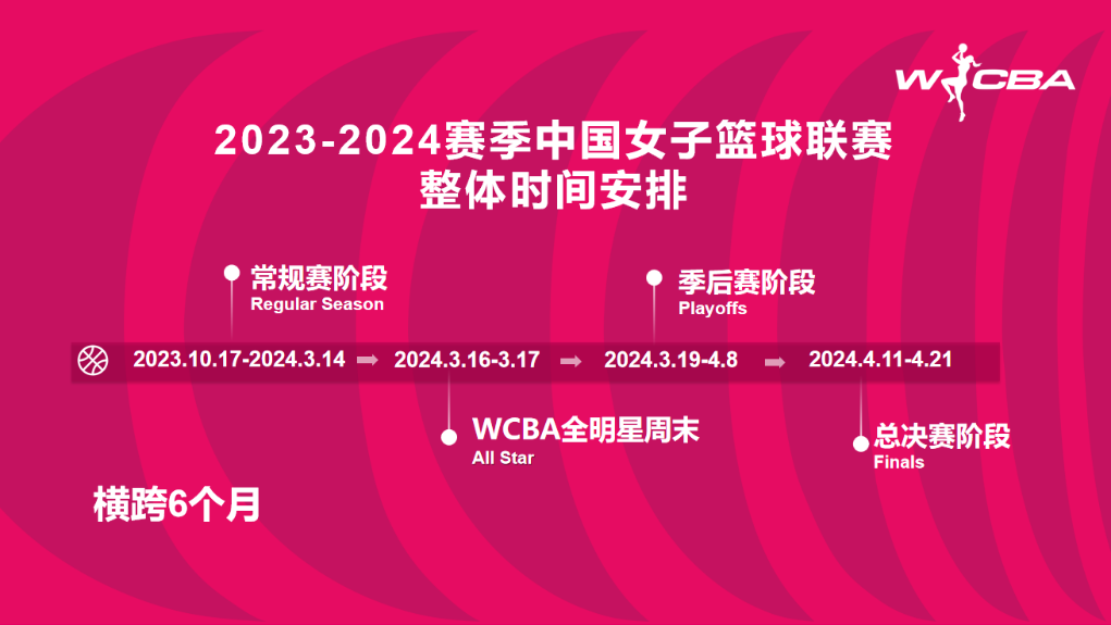 据了解,2023-2024赛季WCBA联赛的整体时间跨度为6个月,考虑到新年、春节,以及为国家队备战和参加巴黎奥运会资格赛留出时间,联赛常规赛会分为两个阶段,第一阶段从2023年10月17日至2024年1月1日,第二阶段从2024年2月17日至3月14日。全明星周末活动将在2024年3月16至17日举办。季后赛和总决赛阶段从3月19日至4月21日。