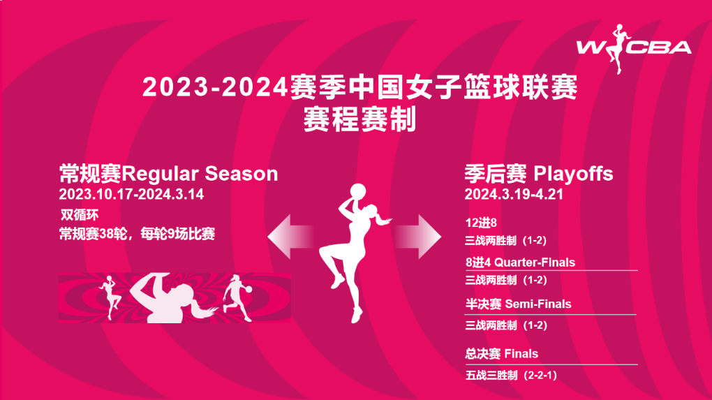 新赛季WCBA联赛采取主客场双循环赛制,常规赛38轮,每轮9场比赛。季后赛三战两胜制,总决赛五战三胜制。