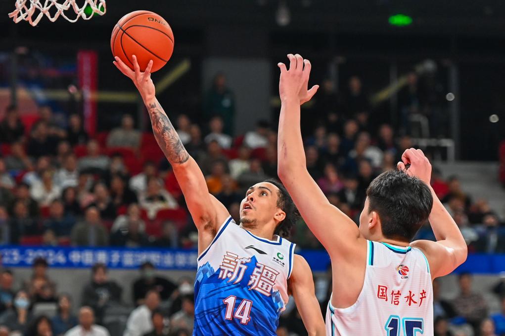 10月31日,新疆伊力特队球员特莱斯(左)在比赛中上篮。新华社记者 丁磊 摄