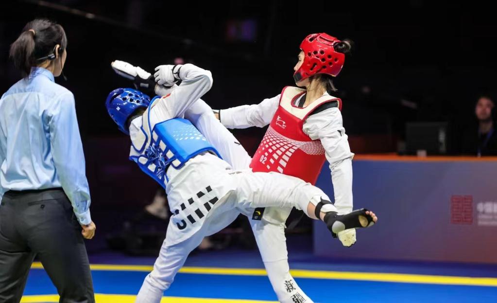 女子49公斤级决赛打到决胜局,山东选手王肖璐与新疆选手马静月战成6:6平,马静月凭借较高难度的两次击头技术优势,惊险夺得冠军。